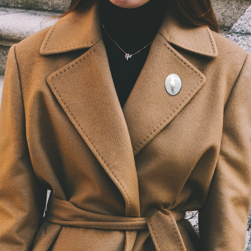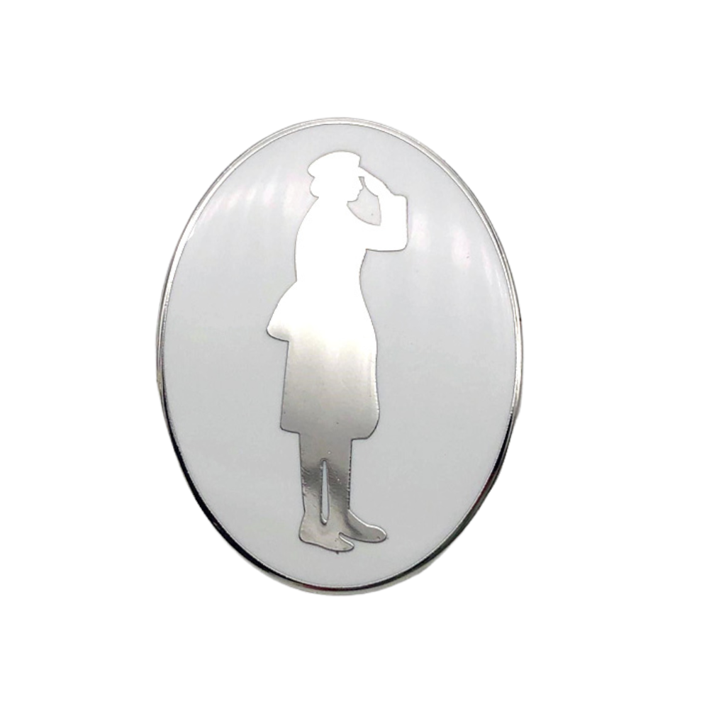 - Features a mirror finish Women in War silhouette against a white background